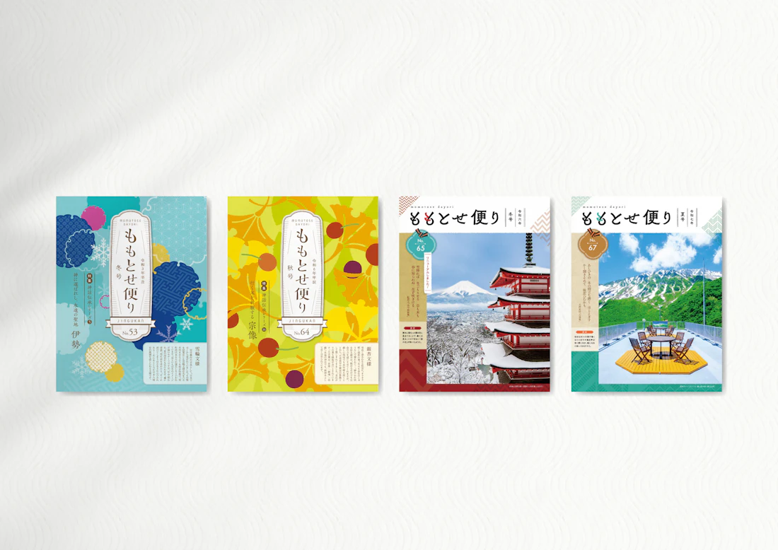 『ももとせ便り』は、「受け取った方が開運されることを願って」をテーマに、暦の知恵とともに季節を感じ、心豊かに日々を過ごすためのヒントを届ける会員誌です。各号の表紙は御朱印帳をイメージしたものや、日本各地の美しい風景をモチーフにしたものなど、いくつかの変遷を経て鋭意継続中です。縁起の良いモチーフや色合いを織り込みながら、「手に取るよろこび」を感じられる装いに仕上げています。