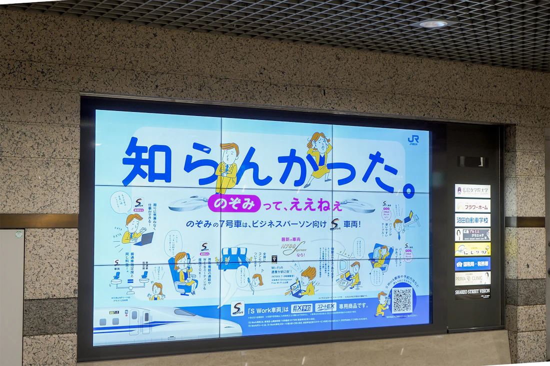 新聞(5紙7種)をはじめ、車内吊り、駅ポスター、デジタルサイネージ、バス停広告、本通りアーケード幕、WEB、SNSなど、幅広いメディアで展開。各媒体の特性に合わせてビジュアルとコピーを最適化し、出張や移動の多いビジネスパーソンの目に自然に届くよう設計しました。特に駅構内や車内といった移動空間での露出効果は高く、S Work車両の認知拡大と利用促進に大きく貢献しました。