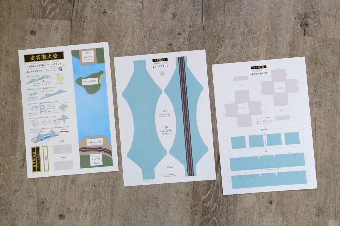 モチーフとなった安芸灘大橋は、呉市と下蒲刈島を結ぶ美しい吊り橋。地域の暮らしや産業を支える重要な交通インフラであり、その構造美もまた多くの人々を惹きつけています。このペーパークラフトは、子どもから大人まで幅広い層が楽しめるように、立体的に組み立てる「ものづくりの面白さ」と、完成までの「つくりやすさ」のバランスを丁寧に設計しました。