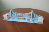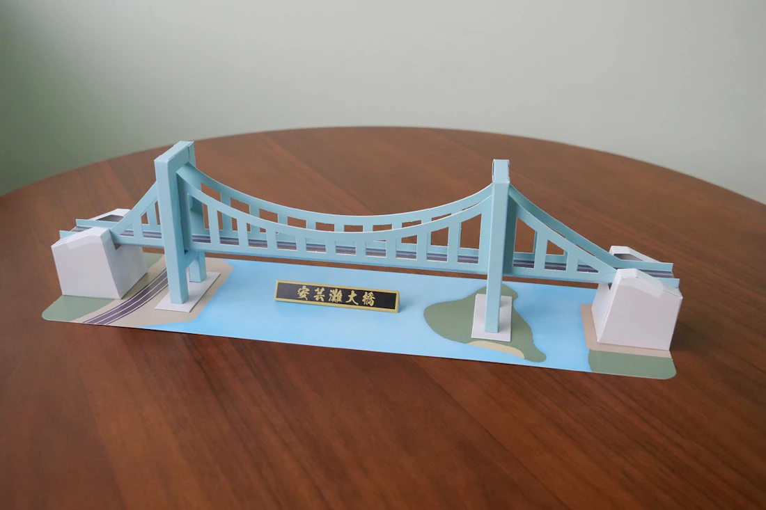 デフォルメ設計にあたっては、実際の橋の図面をもとに構造を読み解き、塔・ケーブル・橋桁といった要素を紙上で再構築。橋を支える仕組みや構造の妙を、組み立ての過程で自然に理解できるよう工夫しています。トムソン加工を施したA3サイズの厚紙3枚1組で、完成時には高さ約92mm × 幅100mm × 長さ380mmの立体ジオラマが完成します。