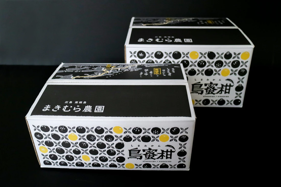 ダンボールを並べたとき、島の風景が連なるような構成にしているのも特徴です。出荷作業の現場でも、まきむら農園の世界観が一面に広がるようデザインされており、島での営みそのものがパッケージの中に息づいています。
