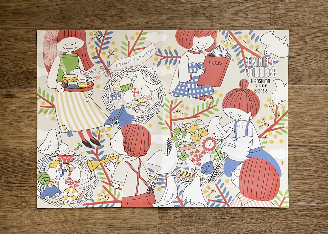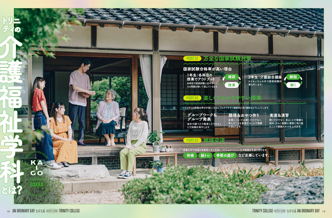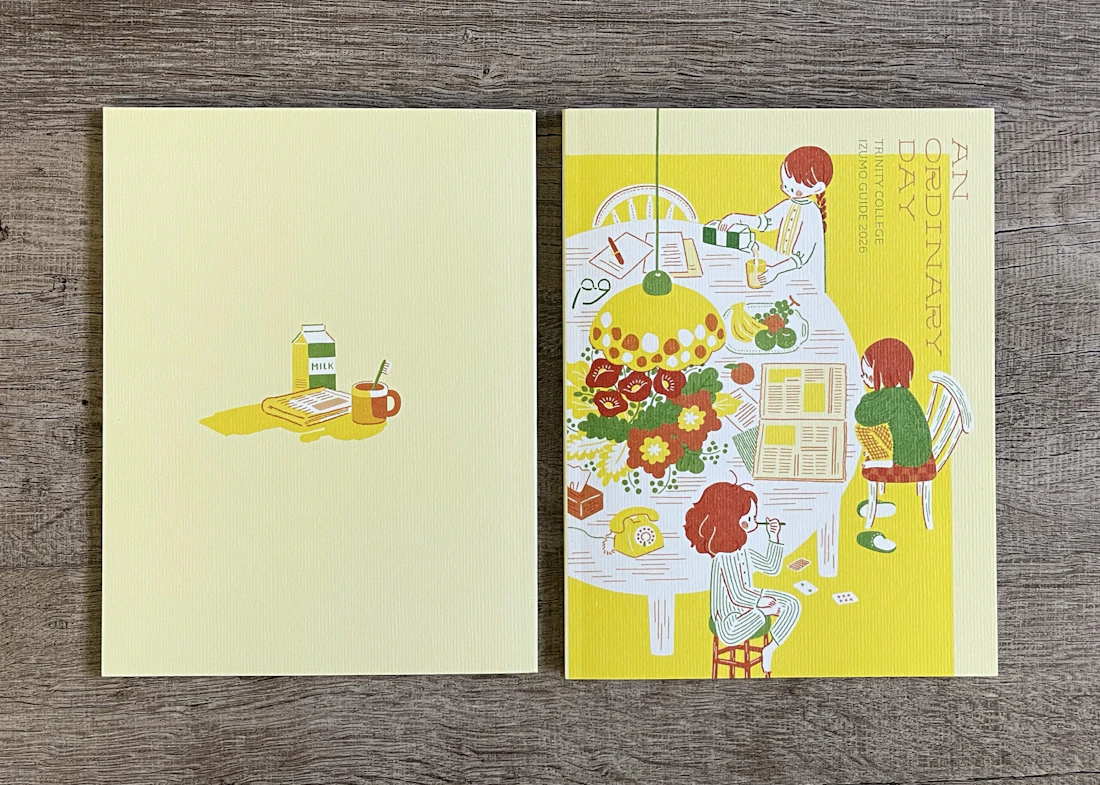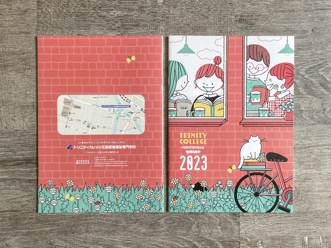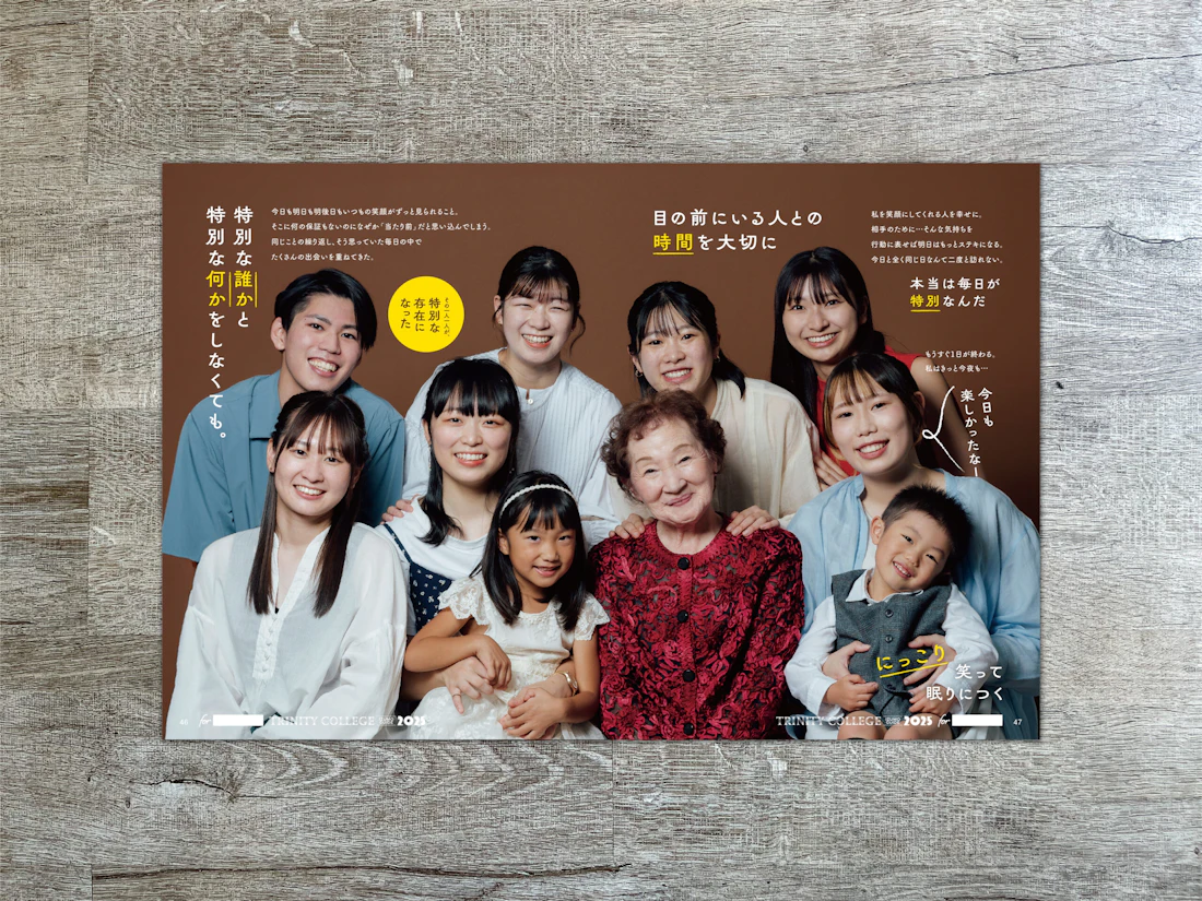 広島県と島根県に拠点を置くトリニティカレッジ広島医療福祉専門学校とトリニティカレッジ出雲医療福祉専門学校。福祉・介護・保育など、人の暮らしを支える専門職の育成に長年取り組んできた2校の学校案内パンフレットを制作しました。これまで長きにわたり継続してご依頼をいただいており、今回のコンセプトは「日々を過ごしていくことの愛おしさ」と「その中で見つけるトクベツ」。日常を肯定する温かな世界観を軸に構成しています。