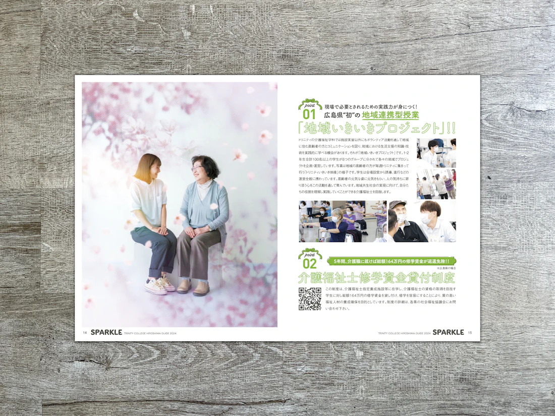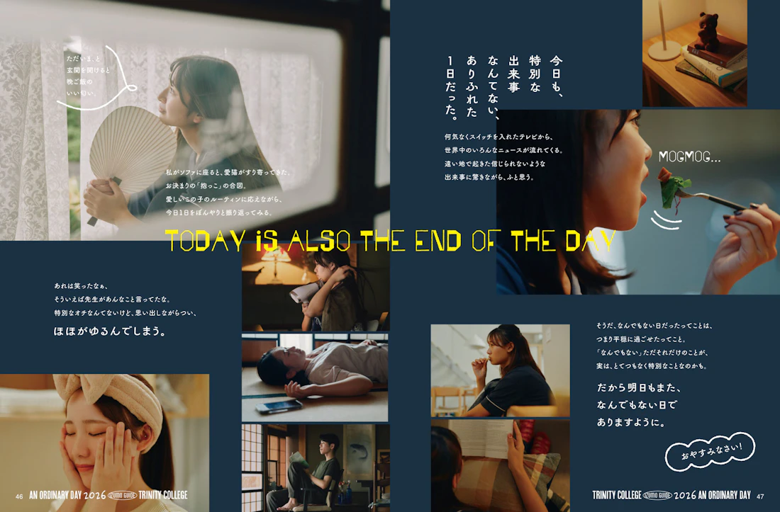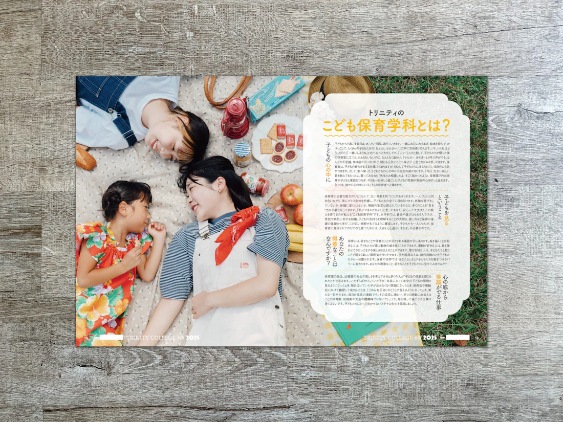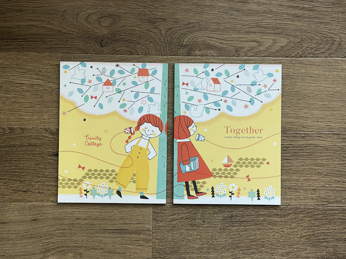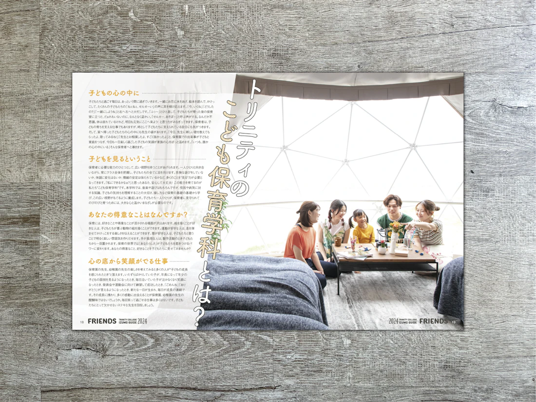 広島県と島根県に拠点を置くトリニティカレッジ広島医療福祉専門学校とトリニティカレッジ出雲医療福祉専門学校。福祉・介護・保育など、人の暮らしを支える専門職の育成に長年取り組んできた2校の学校案内パンフレットを制作しました。これまで長きにわたり継続してご依頼をいただいており、今回のコンセプトは「日々を過ごしていくことの愛おしさ」と「その中で見つけるトクベツ」。日常を肯定する温かな世界観を軸に構成しています。