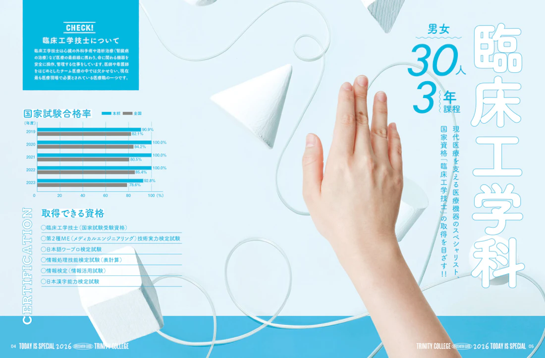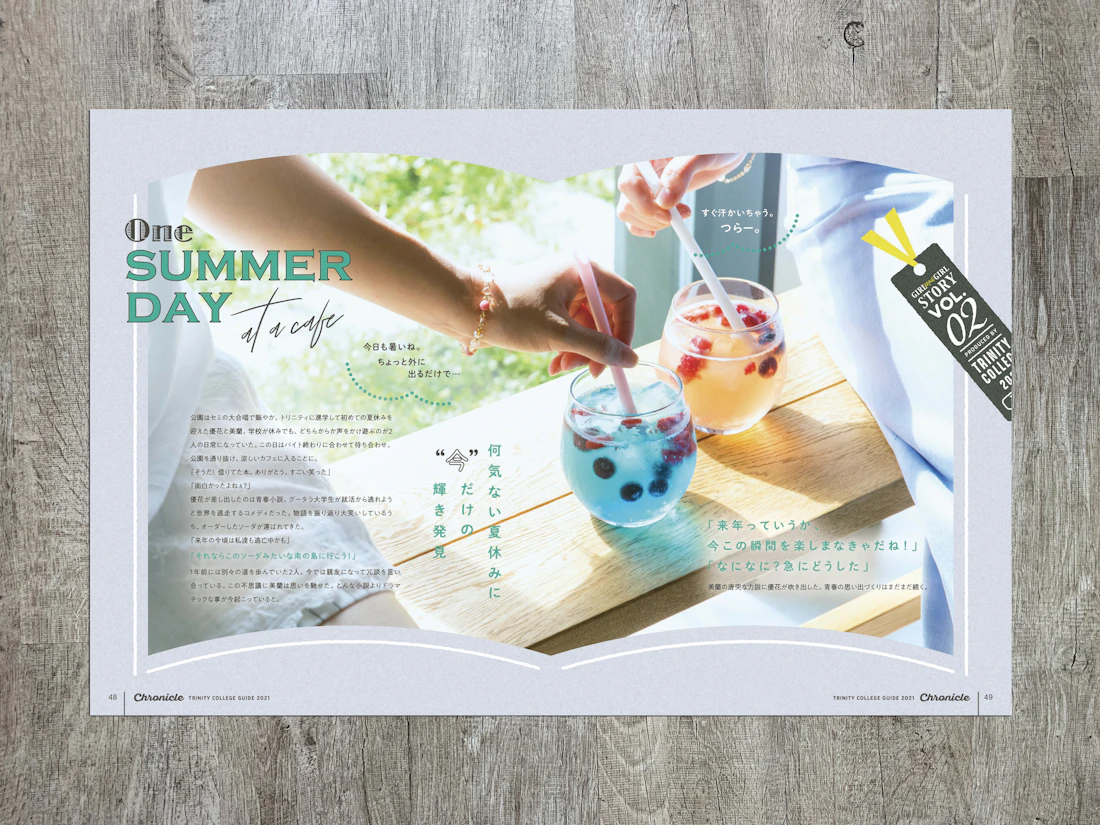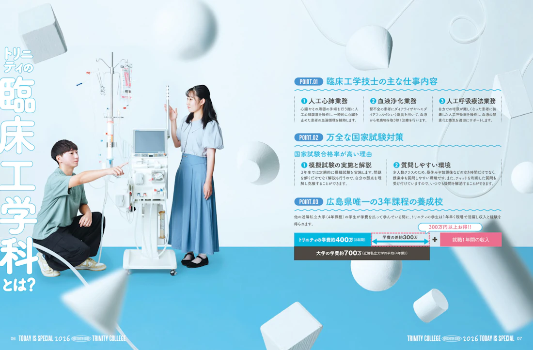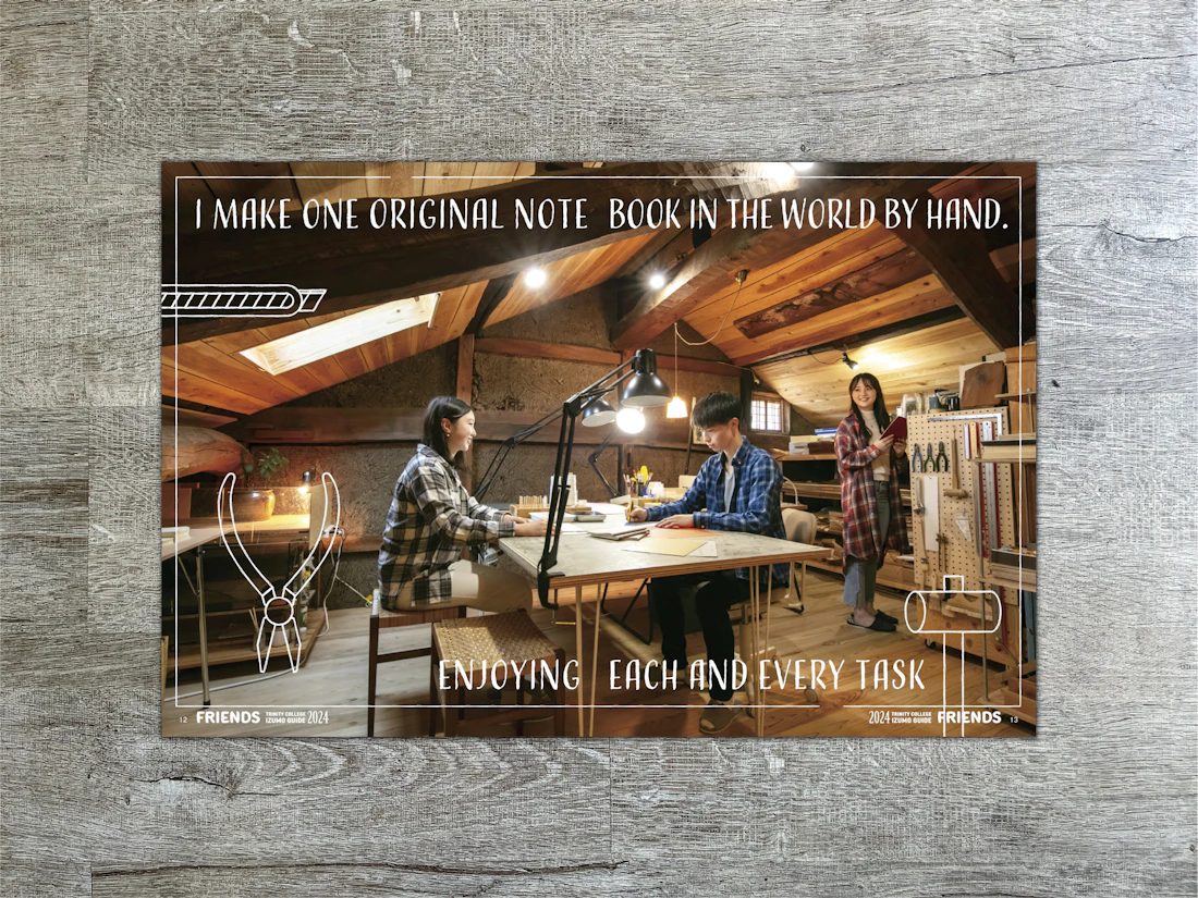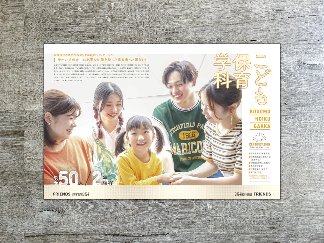 広島県と島根県に拠点を置くトリニティカレッジ広島医療福祉専門学校とトリニティカレッジ出雲医療福祉専門学校。福祉・介護・保育など、人の暮らしを支える専門職の育成に長年取り組んできた2校の学校案内パンフレットを制作しました。これまで長きにわたり継続してご依頼をいただいており、今回のコンセプトは「日々を過ごしていくことの愛おしさ」と「その中で見つけるトクベツ」。日常を肯定する温かな世界観を軸に構成しています。