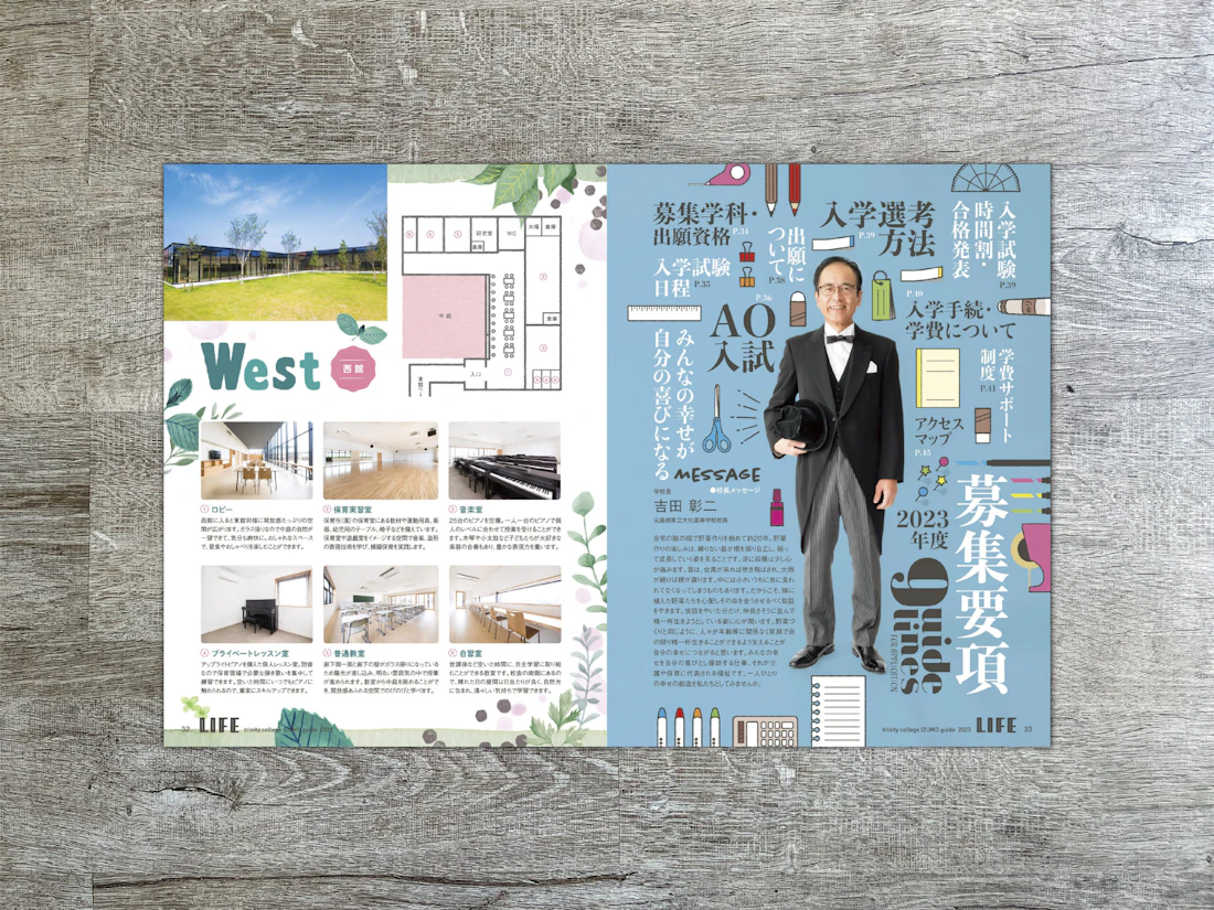 デザインは両校に共通して温かみと物語性を感じさせるトーンで統一しました。イラストレーターによる柔らかなタッチが「日常の愛おしさ」を包み込み、写真は事前演出を最小限に抑え、現場の自然な表情や光を活かした撮影でリアルな温度を伝えています。広島校では各学科ごとに配置した白いオブジェを象徴的モチーフとし、知識の継承や人生の歩みなど、目に見えない価値を造形的に表現しました。