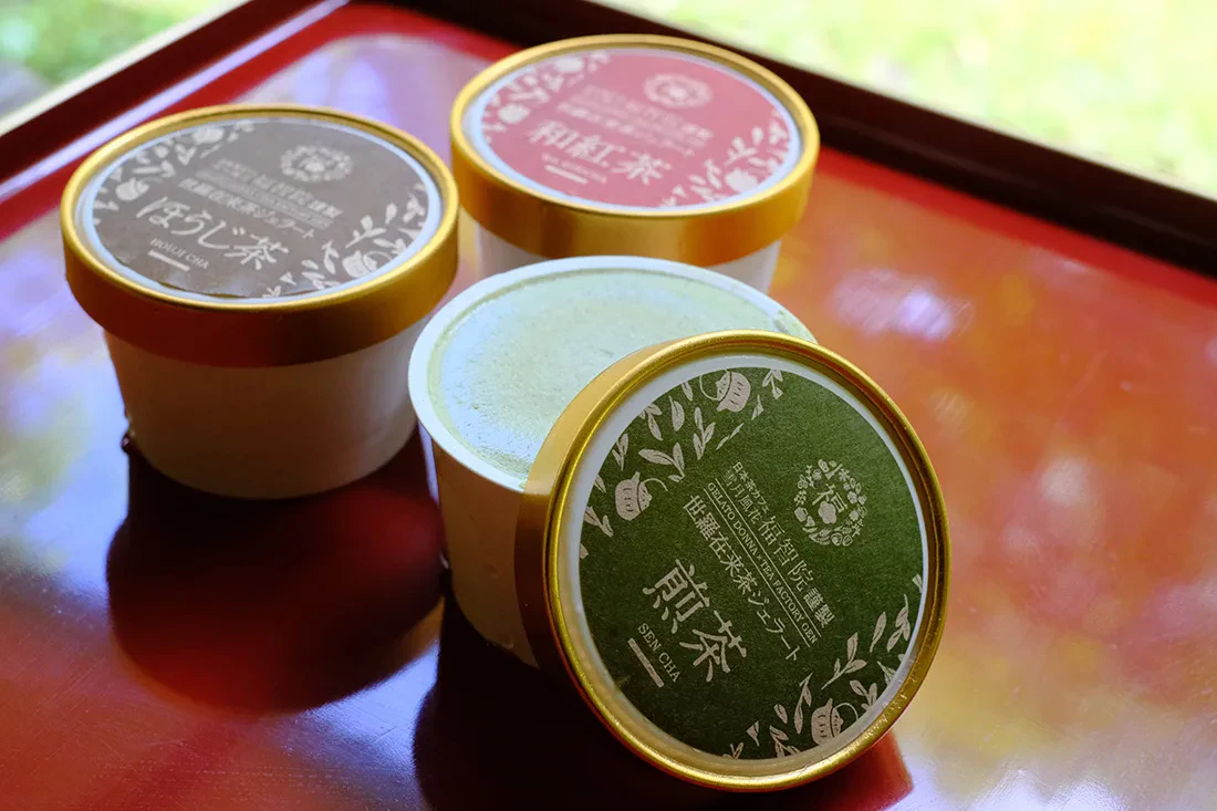 ジェラートラベルは、煎茶・和紅茶・ほうじ茶の3種類を展開。お茶袋を思わせるクラフト紙に、それぞれの茶葉をイメージした色を配し、福智院ロゴと共通の線画タッチで茶葉と急須をあしらいました。店頭に並べたとき、風味の違いがひと目で分かり、世界観としても統一感を持たせています。