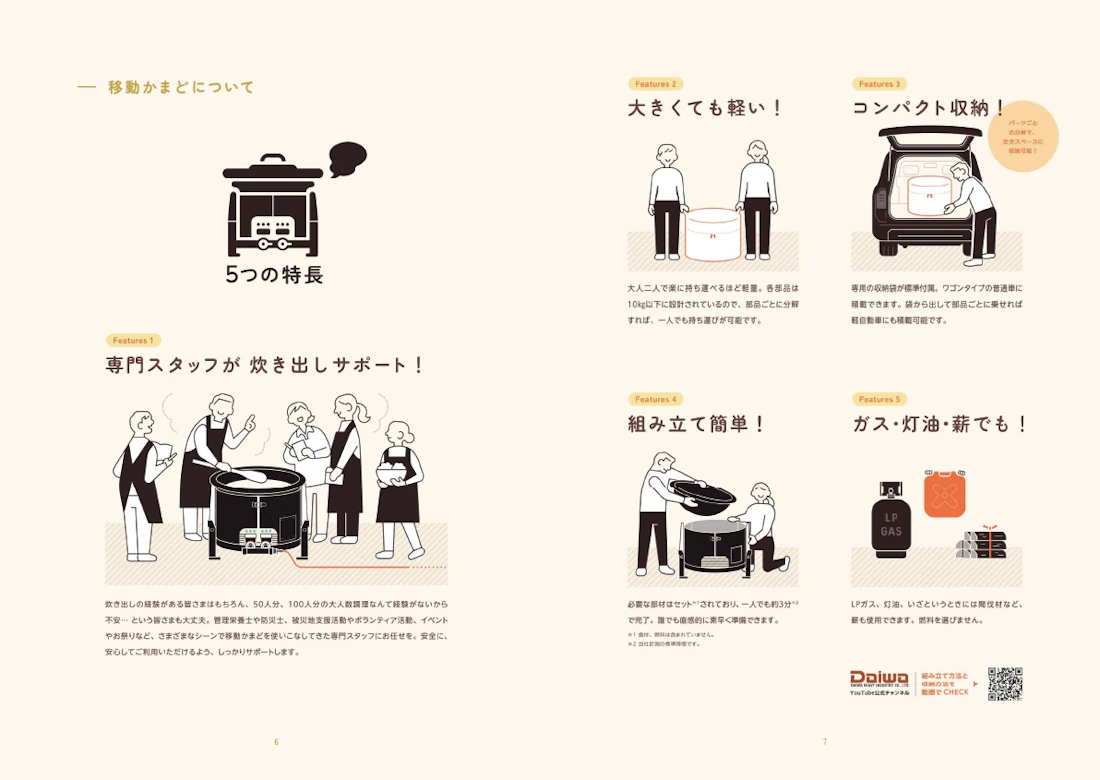 同じタイミングで制作した公式サイトとも連動しており、パンフレットでは移動かまどに関する基本的な情報を知っていただき、ウェブサイトではさまざまな活用方法やお役立ち情報を随時発信・更新していくというように、それぞれに役割を持たせてすみ分けています。