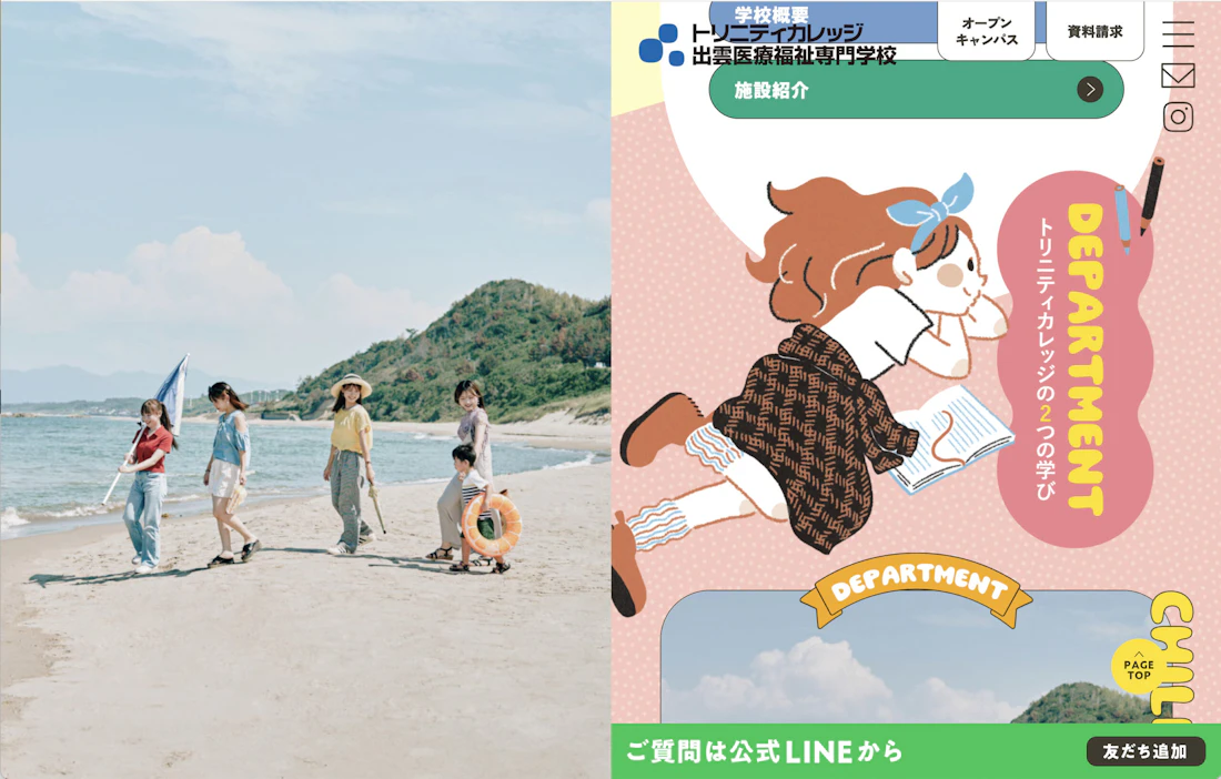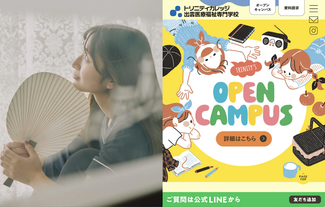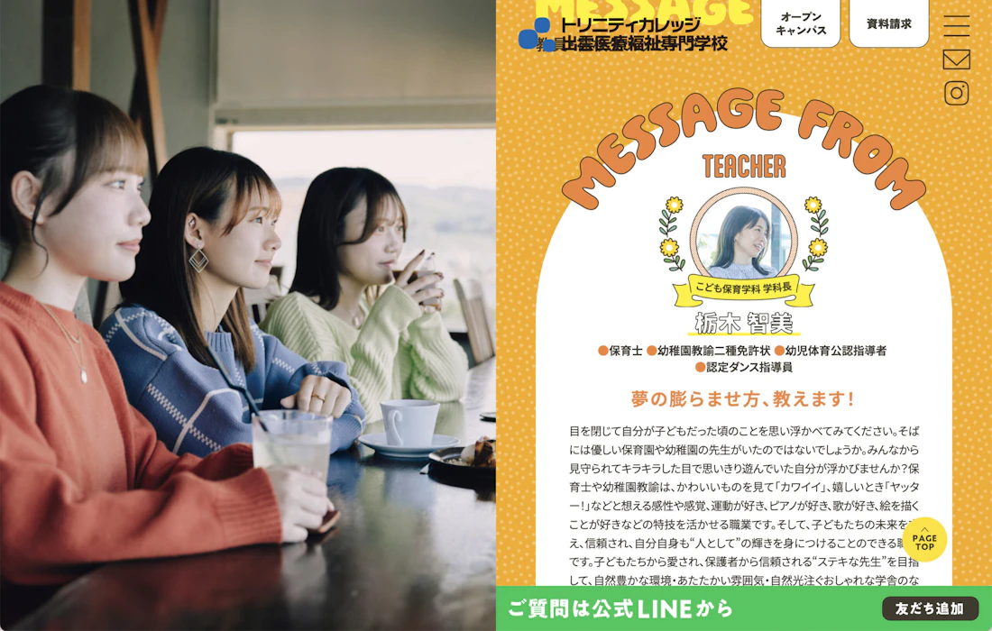 島根県出雲市にある「トリニティカレッジ出雲医療福祉専門学校」は、介護福祉士、保育士、社会福祉士など、福祉分野のスペシャリストを育成する専門学校です。地域社会に寄り添いながら、確かな専門技術と温かな人間性を兼ね備えた人材の育成を目指しています。今回のリニューアルでは、そうした「人を支える仕事」の根幹にある「笑顔」と「ぬくもり」を伝えるウェブサイトを目指しました。
