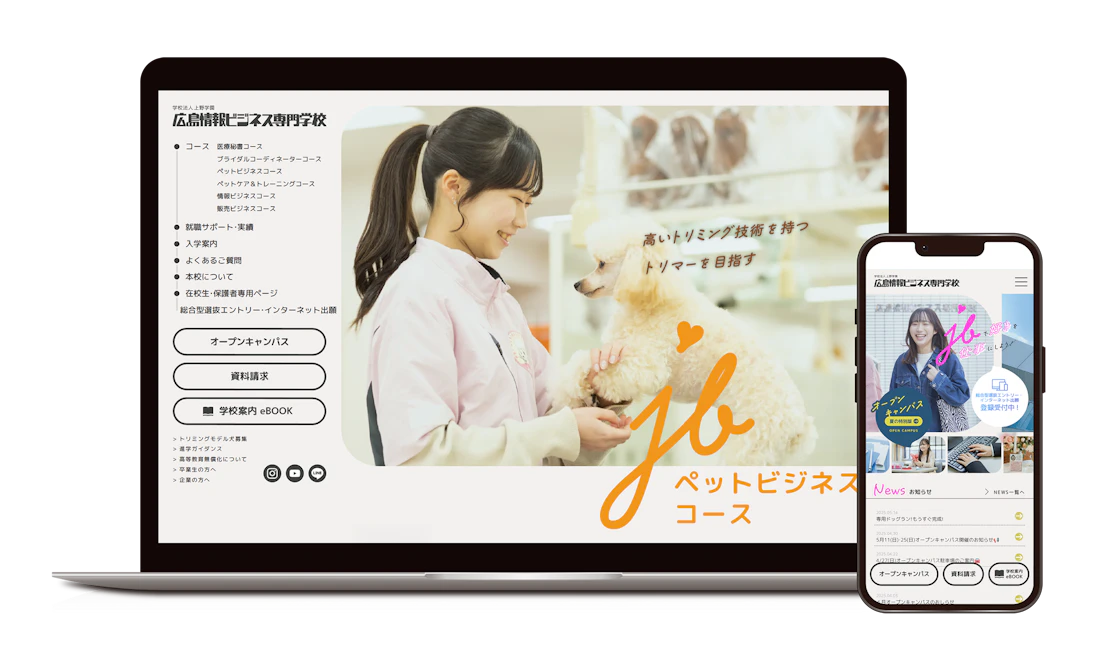 広島情報ビジネス専門学校は、ビジネス、情報、デザインなど、社会で即戦力として活躍できる人材を育成する専門学校です。時代の変化に合わせた実践的なカリキュラムを展開し、学生一人ひとりの夢や目標に寄り添った教育を行っています。そんな同校の魅力や雰囲気を、視覚的にも伝えられるようにデザインされたのが、今回制作したウェブサイトです。