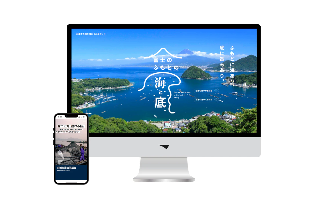 静岡県沼津市が推進する一次産品のブランド化・販路拡大事業の一環として、水産物の魅力を伝える情報発信サイト「富士のふもとの海と底」を制作しました。本サイトは、首都圏の消費者をターゲットに、沼津の豊かな海の恵みをより多くの人々に知ってもらい、実際に味わってもらうことを目的としています。