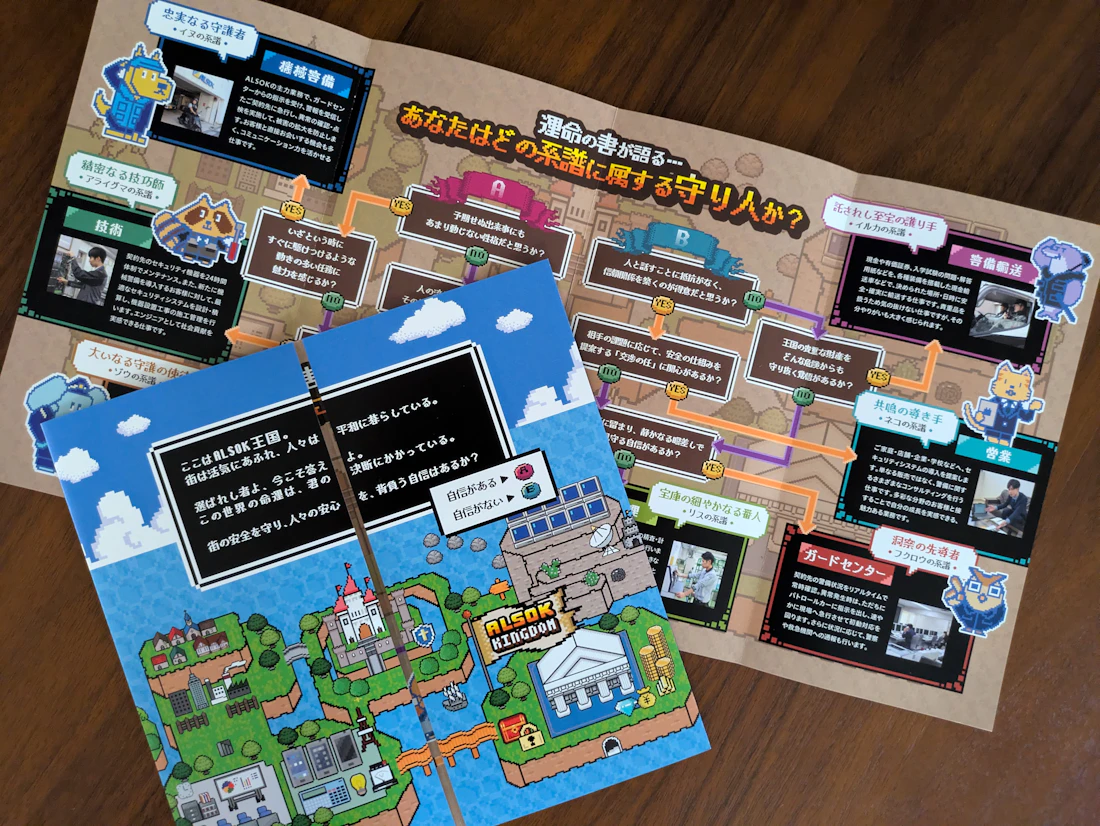 世界観は、採用広報らしからぬレトロゲーム調。「ALSOK王国」を舞台に、読み手がYES/NOで進む「クエスト形式」のチャートで、7つの職種へ導く参加型の構成としました。キャラクターには、各職種の特徴を動物のイメージと重ねて設定し、遊び心と理解しやすさを両立。合同説明会などの現場でも手に取りたくなるよう、驚きと興味を喚起する設計です。