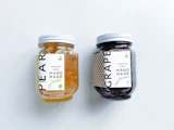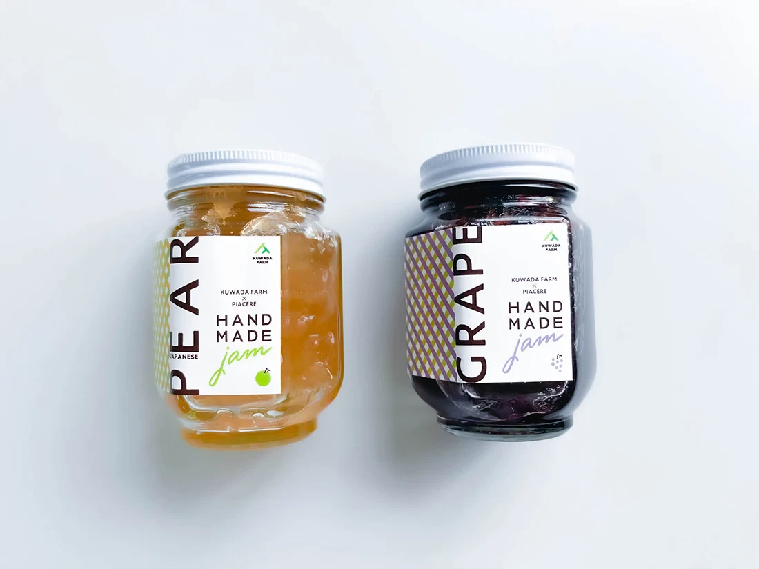 このロゴを基点に、さまざまなツールへと展開。三原のイタリアンレストラン「ピアチェーレ」とのコラボレーションで誕生したジャムのラベルでは、果実を包む緩衝材をイメージした2色のラインをモチーフに採用。久和田農園とピアチェーレ、二者のつながりを象徴的にデザインしました。カラーリングは、それぞれのジャムに合わせて「ぶどう」「なし」を思わせる色合いを選定しています。