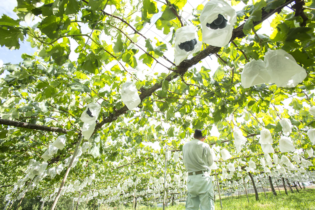 久和田の「久」の字をモチーフに、「人」と「入」という形を組み合わせることで、里山に人が集い、自然と共に生きる情景を抽象的にデザイン。人と自然、そして地域との循環によって成り立つ農園のあり方を、シンプルな構成の中に込めています。さらに、ロゴに実りを象徴する○を組み合わせることで、久和田農園で育てる葡萄・梨・ネギを表現。収穫の喜びや命の循環を感じさせるデザインとしました。