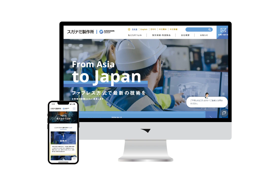 グループコーポレートサイトの刷新に続き、関連企業である株式会社スガナミ製作所のウェブサイトもリニューアル。製品や実績紹介を中心とした構成で、ユーザーがコーポレートサイトから各企業へスムーズにアクセスできるよう導線を設計しました。CMSを活用した更新システムにより、製品情報や画像を登録するだけでトップページや複数ページに自動反映される仕組みを実装。グループ全体のデジタル運用効率を高める仕組みづくりも同時に行いました。