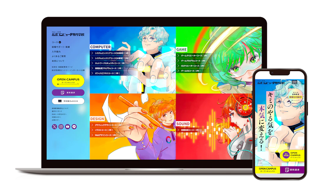 広島コンピュータ専門学校は、IT・ゲーム・デザイン・サウンドの4つの専門分野を軸に、クリエイティブとテクノロジーの両面から次世代のプロフェッショナルを育成する学校です。実践的な学びを通じて、時代の最先端で活躍できるスキルと発想力を養う教育を展開しています。そんな多彩な学びの魅力を、視覚的に印象づけるウェブサイトとしてデザインしました。
