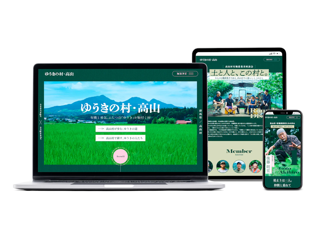 群馬県高山村が推進する有機農業の魅力を発信するために、ブランドサイト「ゆうきの村・高山」を制作しました。サイト名には「有機」と「勇気(ゆうき)」の二つの意味を重ね、農と人、人と村、人と暮らしをつなぐ物語を伝えることをテーマとしています。