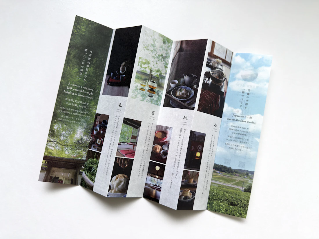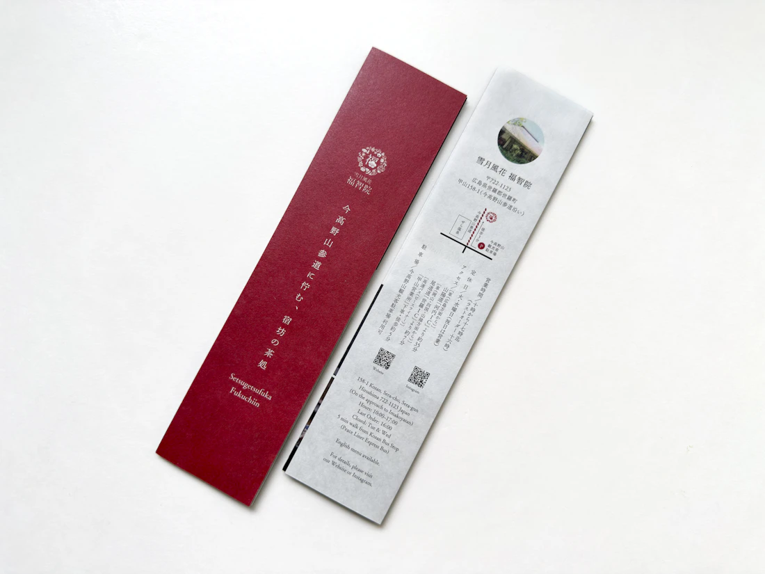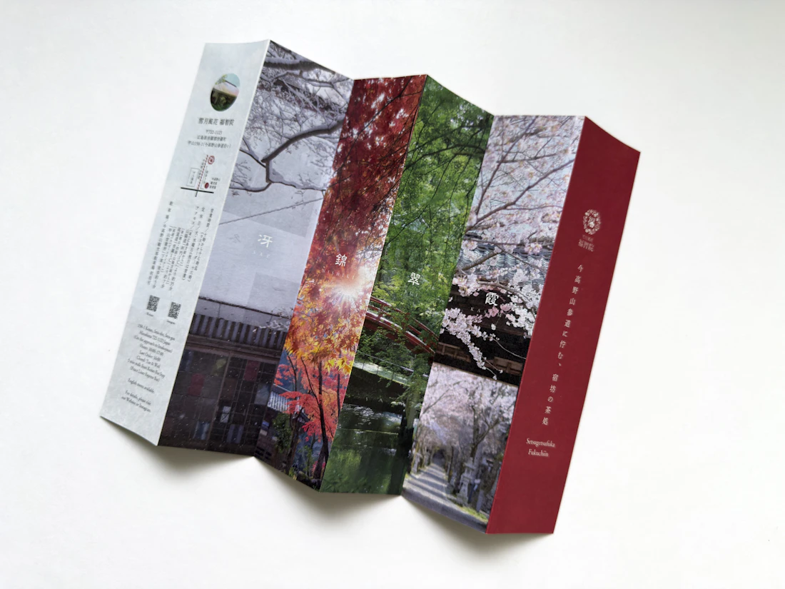 今高野山の参道に佇む宿坊「雪月風花 福智院」のリーフレット制作を担当しました。本案件では、施設を単なる案内対象としてではなく、「時間を過ごす場所」として伝えることを目的に、構造設計からビジュアル表現まで一貫して設計しています。