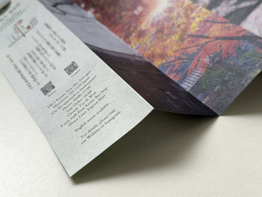 一般的なリーフレットでは、施設情報やメニューなどの機能的な情報が中心となりがちですが、本制作ではそのアプローチを転換。紙面を読む行為そのものを、参道を進み、のれんをくぐり、空間へと入っていく体験に重ねることで、「訪れる前に体験が始まる」構造を目指しました。