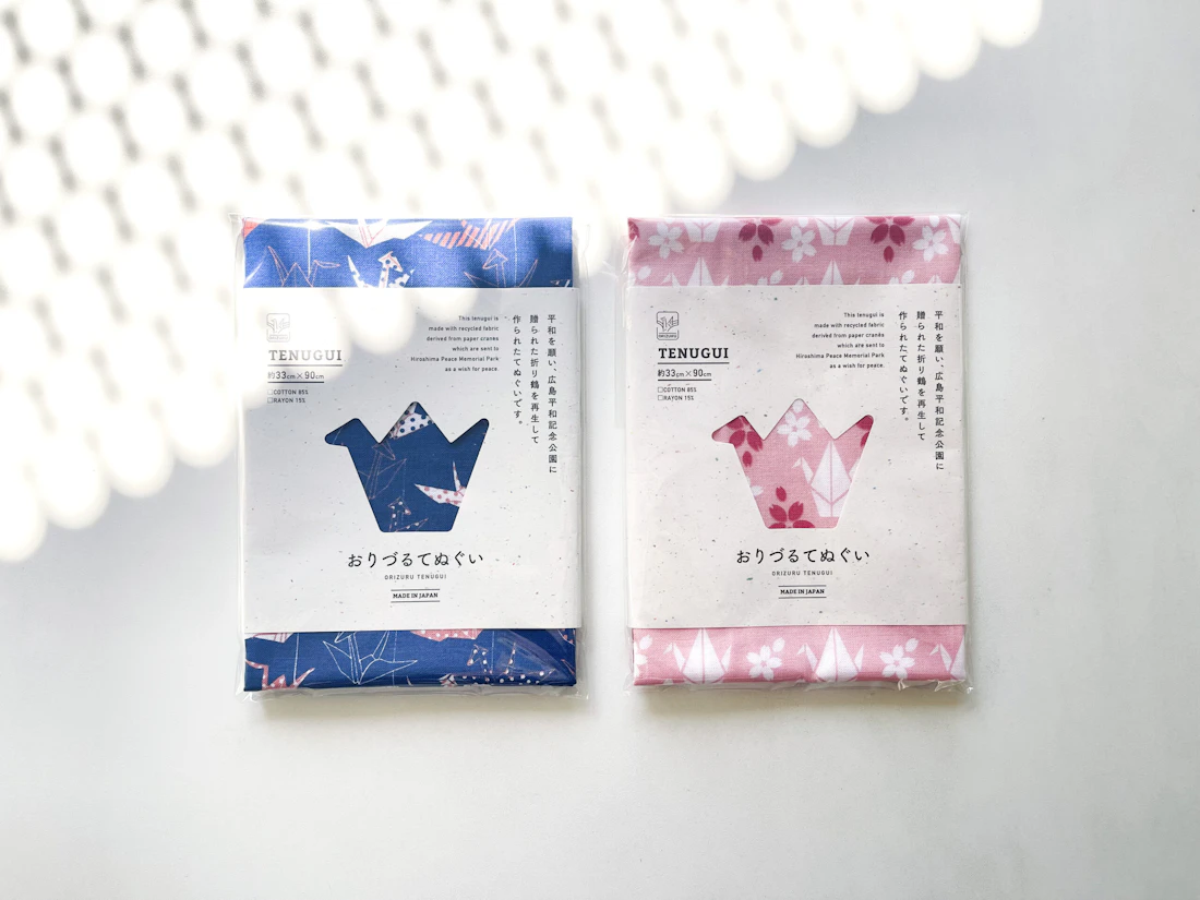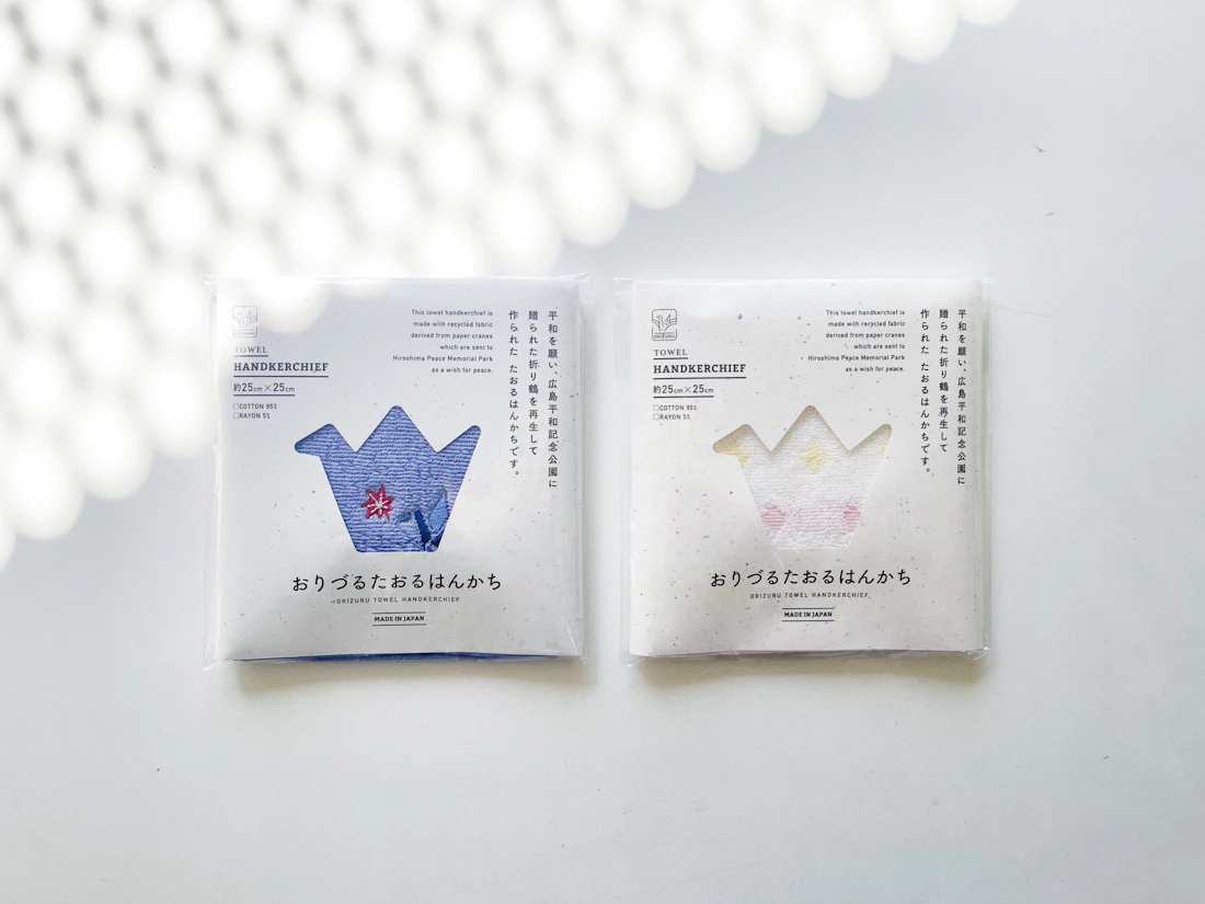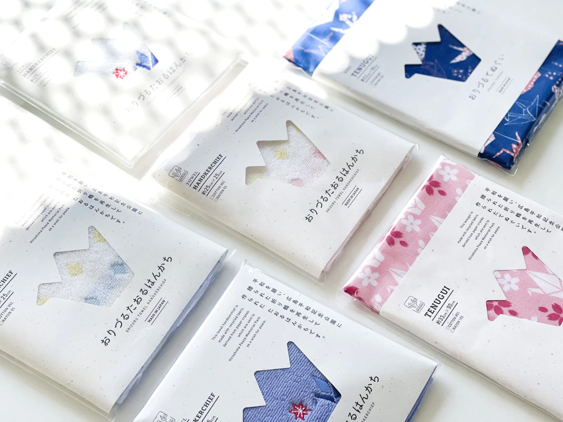 シリーズは「おりづるたおる」「おりづるたおるはんかち」「おりづるてぬぐい」「おりづるてぬぐいはんかち」の4種類展開。すべて同一型の帯紙パッケージとし、素材やサイズの違いを超えてシリーズとしての一体感を実現しています。売り場に並んだ際には、折り鶴の形が連なり、平和と再生の象徴が自然と視覚的に伝わるデザインです。