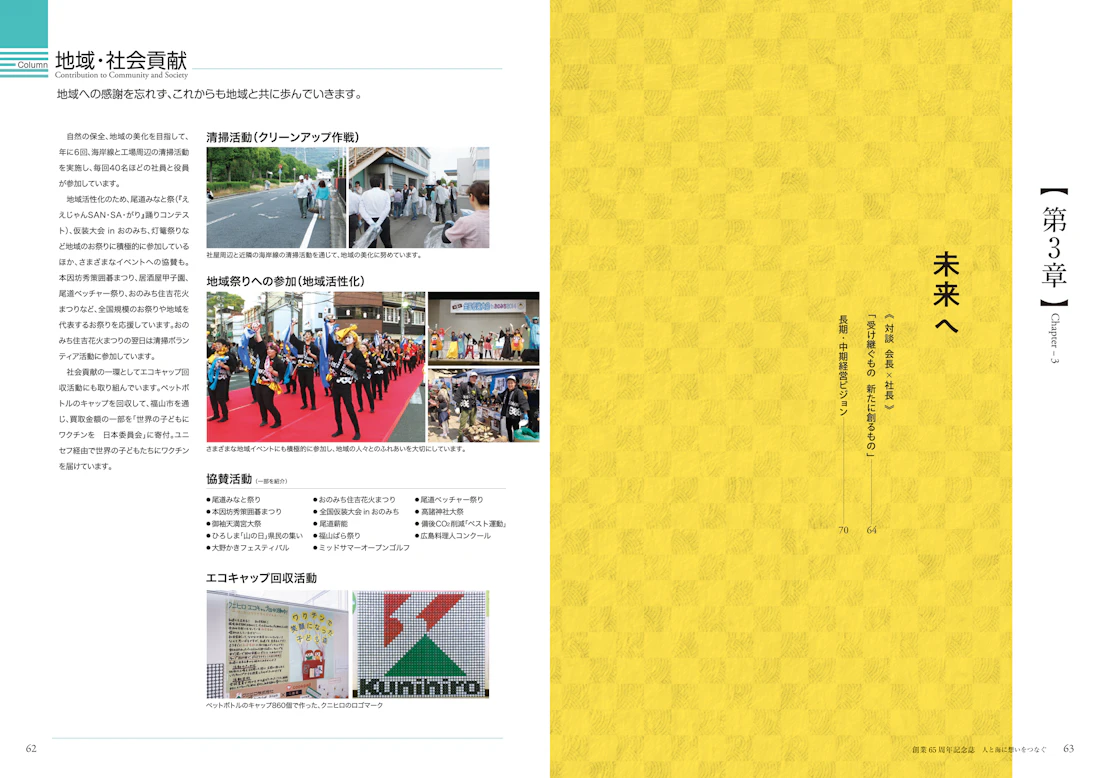 第2章では「会社の今」をテーマに、社員が主役のページを展開。現場で働く姿や社内の雰囲気を多数の写真で紹介するほか、「5年後の約束」として、創業70周年時に達成したいこと・実現したい夢を社員一人ひとりが語る企画を掲載しました。働く人々の声を記録することで、未来のクニヒロを自ら描くきっかけとなる構成としています。