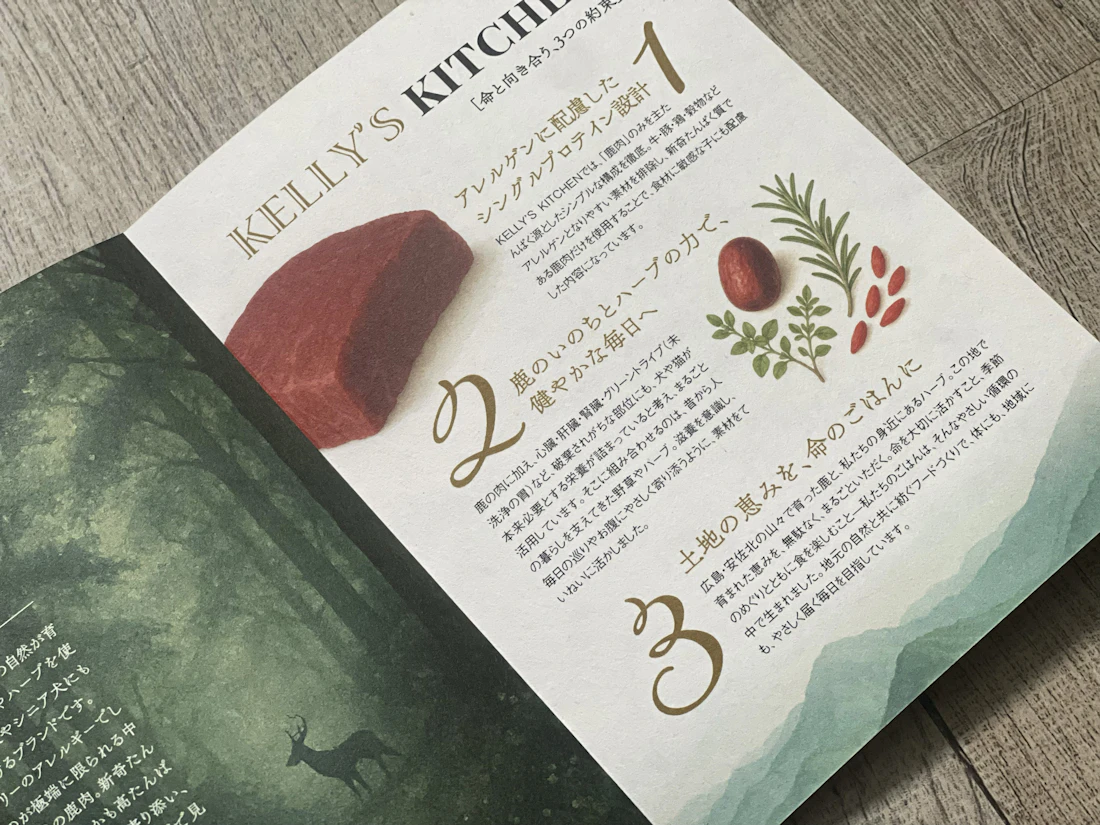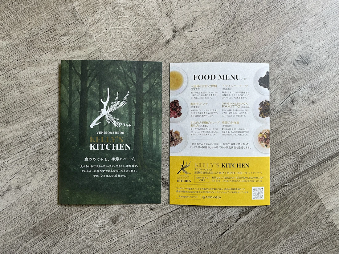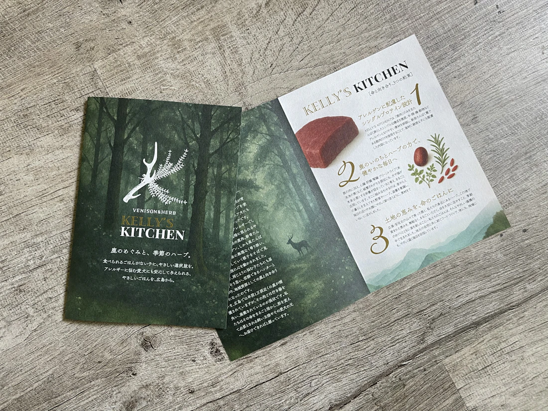 広島の自然に育まれた鹿肉と周防大島産のハーブで、犬と猫のための安心な食を届けるブランド「KELLY’S KITCHEN」。そのロゴマークとブランドリーフレットのデザインを担当しました。