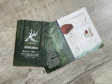 同時に制作したブランドリーフレットでは、「いのちをまるごと活かす」という思想をビジュアルで語る構成に。森の奥に光が差し込むような深緑の世界観を背景に、鹿の姿とロゴが静かに浮かび上がります。用紙には、ざっくりとしたラフな風合いと、クラフト紙やダンボールのような素朴な色が特徴的なFSC認証紙〈ブンペル〉を採用。自然由来の繊維感と手触りが、環境配慮とブランドの誠実さを手に取る人に伝えます。