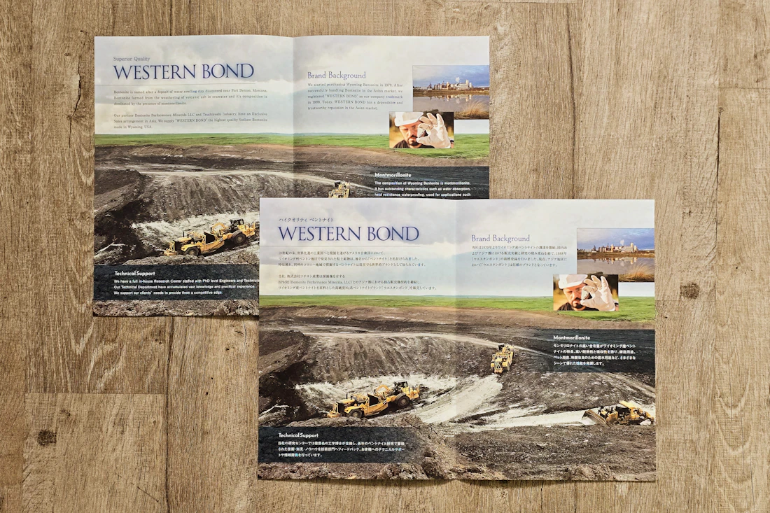 同社は鋳造関連の資材を中心に取り扱い、ベントナイトの世界的産地であるアメリカ・ワイオミング州のBPM社とアジア圏における独占販売契約を締結しています。今回の制作では、その主力製品「ウエスタンボンド」のブランド訴求と商談サポートを目的とした販促ツールを、日本語版・英語版それぞれで展開しました。