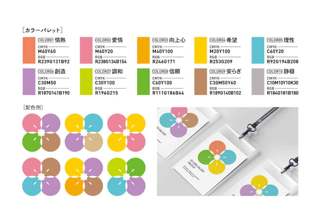 基本カラーの他に多様なカラーパレットを用意し、使う人や場面によって色を変えられる柔軟な設計としています。さまざまな人の光が集い、重なり合うことで無数の輝きが生まれていく——そんなテラスハートジャパンの理念を、ロゴの色と形に込めています。