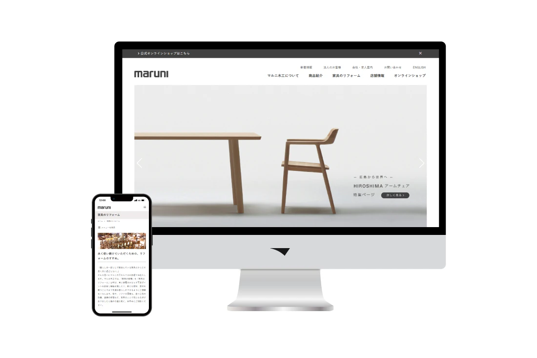 海外版と国内版を統一感あるデザインで展開することで、ブランド全体の世界観を強化。シンプルで洗練されたビジュアルと高い運用性を両立した、マルニ木工の「今」と「これから」を象徴するウェブサイトに生まれ変わりました。