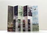 構造面では、蛇腹折りを採用。めくる動作に時間の流れを持たせることで、外から内へと意識が移り変わる感覚を紙面上で再現しています。外面は白を基調とした余白から始まり、春夏秋冬の風景を縦に連続させることで、現実から福智院の世界へと入っていく導入を設計。そこに「霞・翠・錦・冴」といった一字の表現を添え、説明ではなく象徴として季節の層を提示しています。